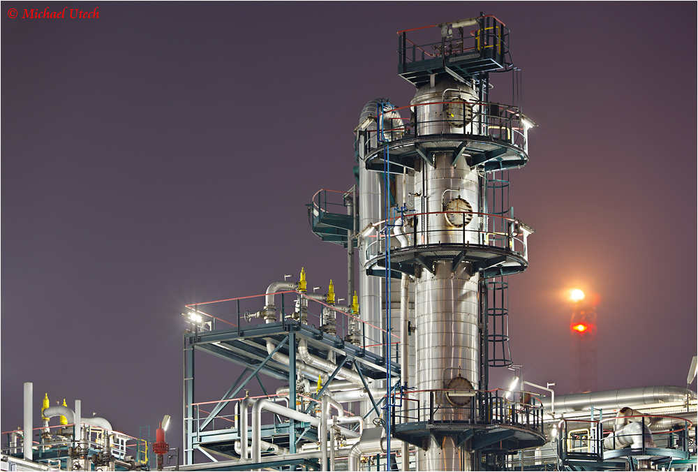 Detail eines der Destillationstürme mit Gasfackel im Hintergrund.