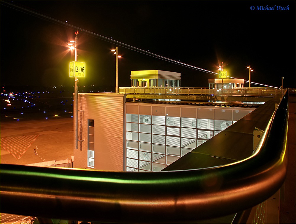 Startendes Flugzeug hinter den Gate-Gebäuden.