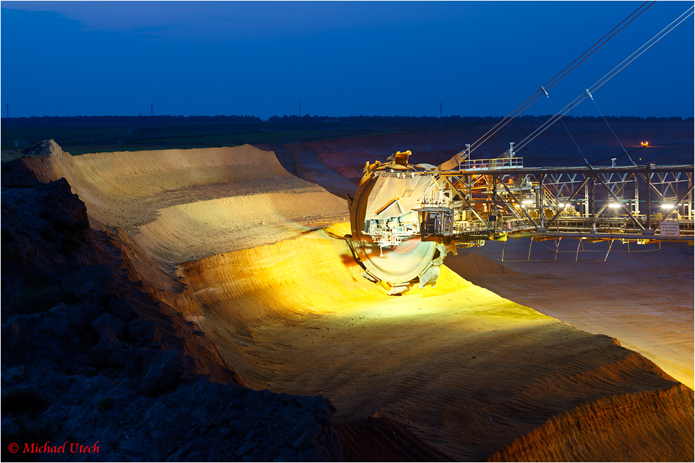 Die eigentliche Abbaustelle am Schaufelrad wird gleißend hell angestrahlt.