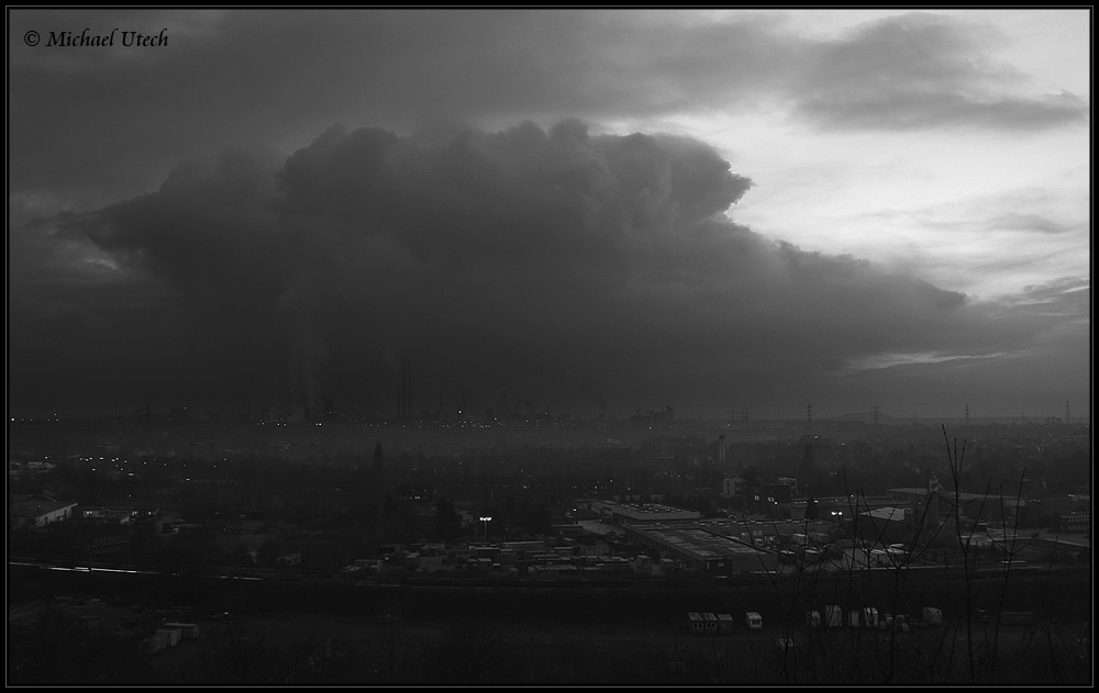 Finsterer Wolkenberg über Duisburg, ein wenig nachgeholfen bei der Stimmung mit EBV.