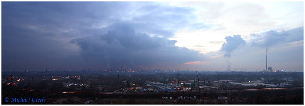Panoramablick - Links mittig Kokerei Schwelgern und die anderen Werke in Duisburg, rechts MVA Asdonkshof. Im Vordergrund die A59.