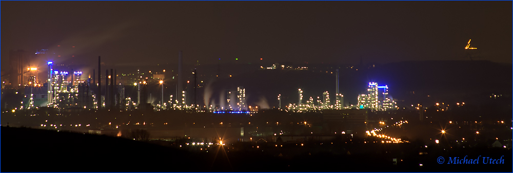 Sicht über das westliche Ruhrgebiet. Das mittige Werk ist die VEBA-Öl in Gelsenkirchen-Horst, rechts sieht man den Tetraeder Bottrop