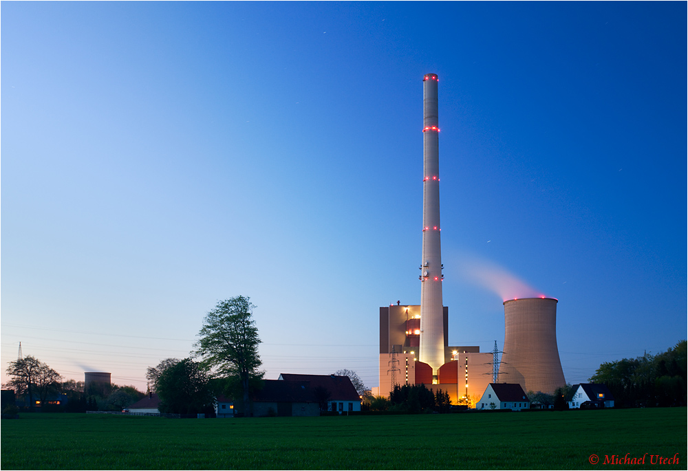 Das Kraftwerk Ibbenbüren mit ein paar Wohnhäusern im Vordergrund.