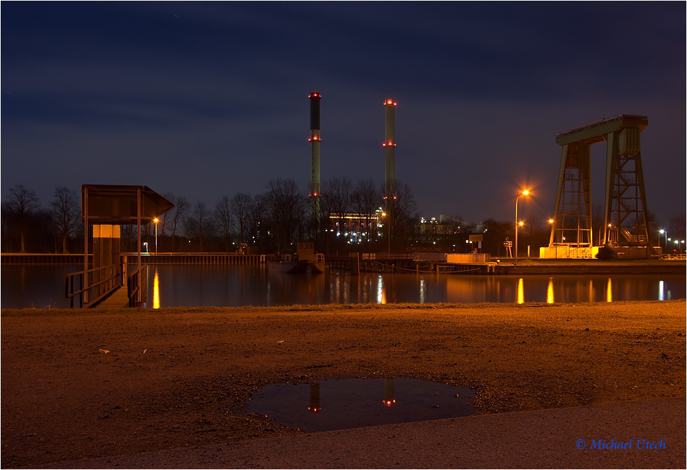 Die Schlote der Corus Aluminium spiegeln sich in einer Pfütze.