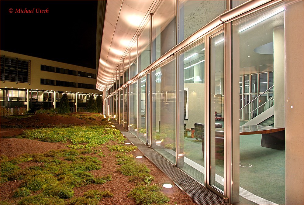 Glasfront der Bank. Ein Teil der Beleuchtung wird so gegen 11 Uhr ausgeschaltet.