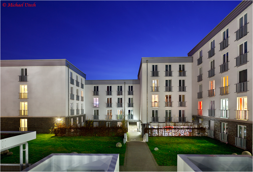 Blick von der Haupttreppe auf Haus C und D, sowie den Studis Kiosk.