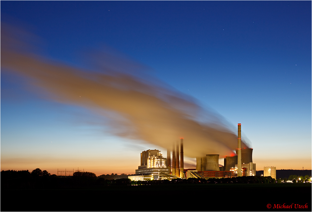Kraftwerk Neurath mit langer Dampffahne und perfekter blauer Stunde.