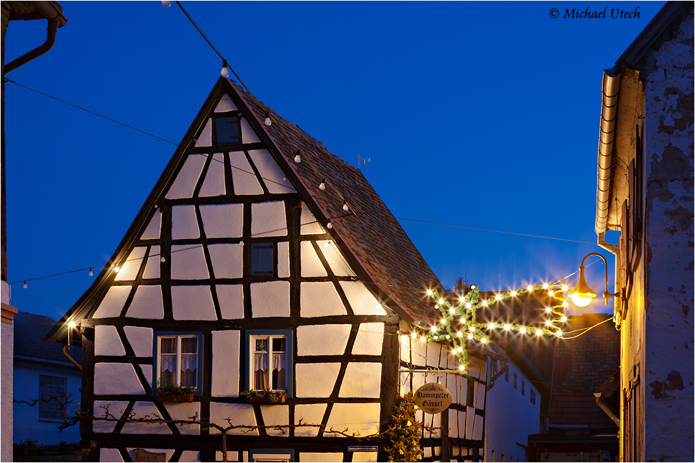 Blaue Stunde mit Weihnachtsbeleuchtung.