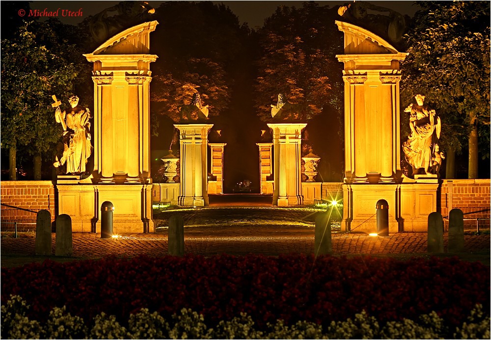Die drei Tore. In die andere Richtung gesehen. Leider fehlen den Figuren oben die Köpfe, was im Dunkeln aber nicht zu sehen war.