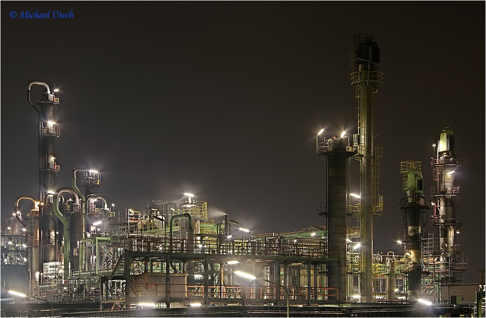 Ausschnitt aus den unzähligen Rohren, Türmen und Lampen.