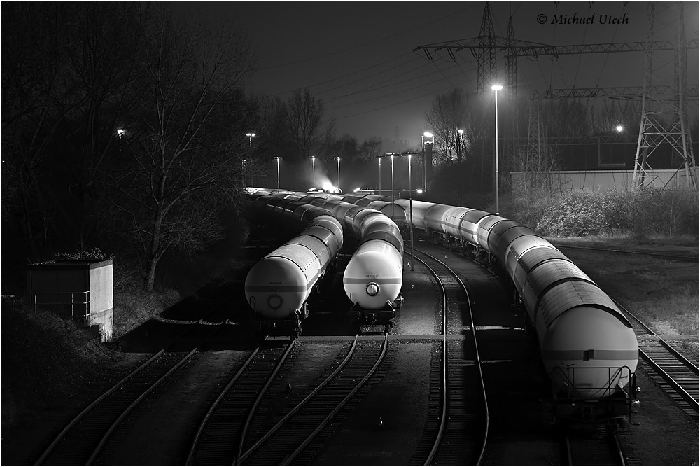 Abgestellte Anhänger auf den Gleisen.