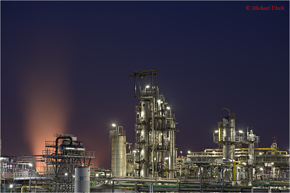 Eine etwas weiter gefasste Ansicht, im Hintergrund sieht man einen kleinen Kühlturm, dessen Dampf von warmen Lampen erleuchtet wird.