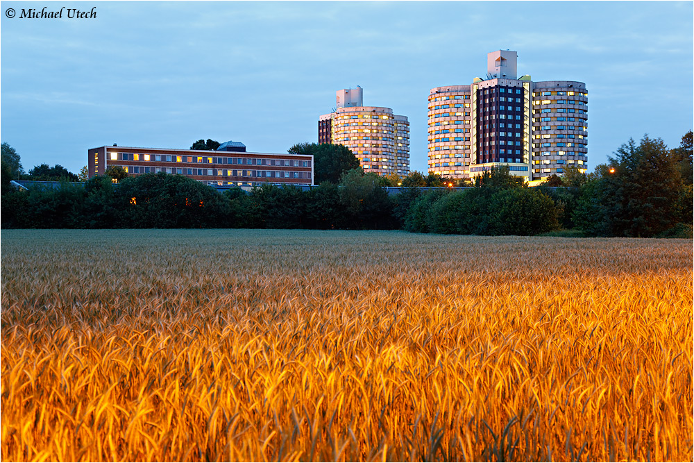 Erste Aufnahme noch vor Beginn der blauen Stunde, das Feld vorne wurde durch warme Straßenlaternen beleuchtet.