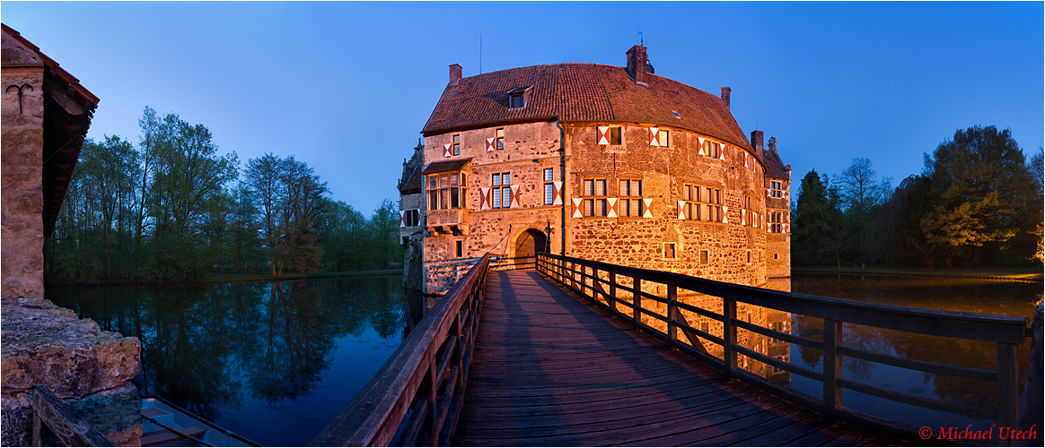 Panorama an der Frontseite zu Beginn der blauen Stunde.