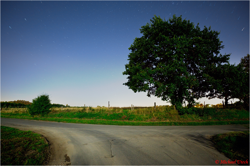 Eine Feldwegkreuzung im Mondlicht.