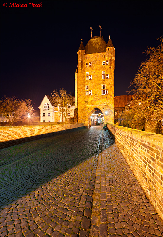 Blick durch das Klever Tor zum Weihnachtsmarkt in Xanten.
