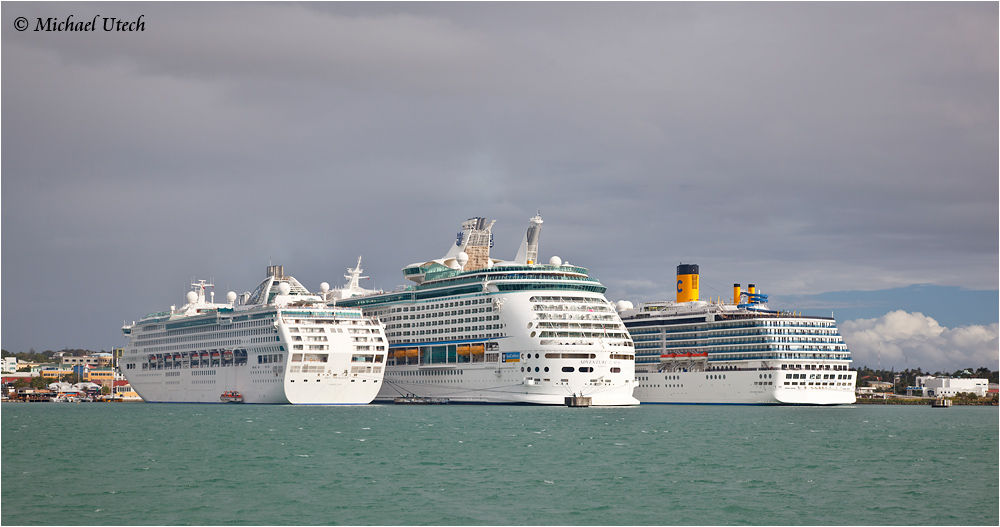Hinter den gigantischen Pötten wirkt die Stadt winzig. Die Adventure of the Seas in der Mitte zählt zu den größten Kreuzfahrtschiffen der Welt.