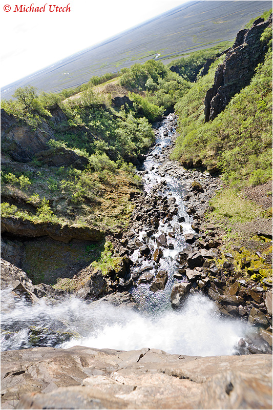 Blick den Hundafoss hinunter, aufgenommen an der Kante auf dem Bauch liegend ;-)