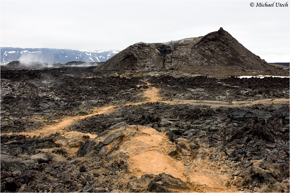 Ein paar Fußwege führen durch rabenschwarze Lava und Dampf.