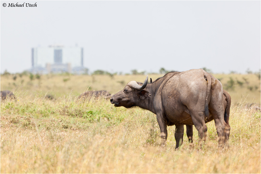 Ein Büffel im Nairobi National Park. Der Park liegt direkt vor der Stadt und hat daher eine etwas ungewöhnliche Skyline.