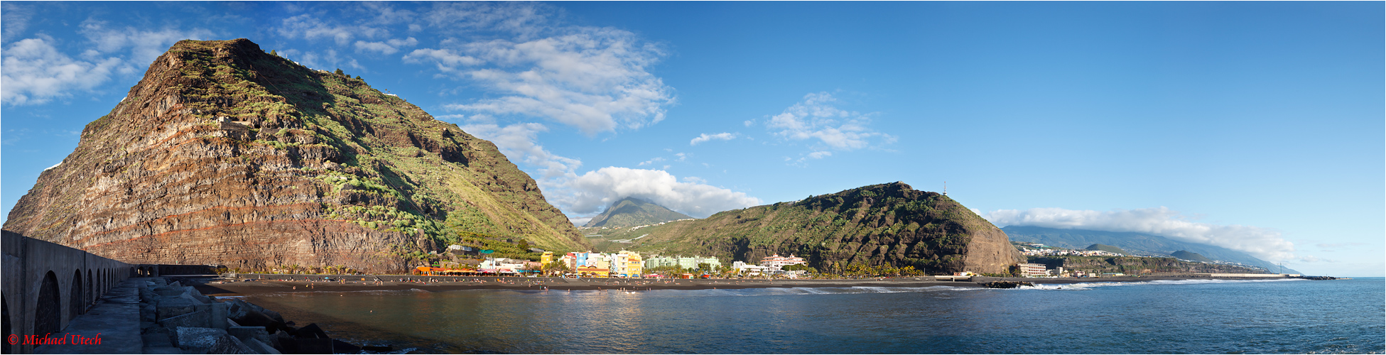 Panorama von der Schutzmauer aus, die Klippen links sind etwa 400m hoch.