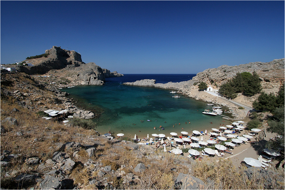 Eine fast vom Meer getrennte Bucht hinter der Akropolis von Lindos.