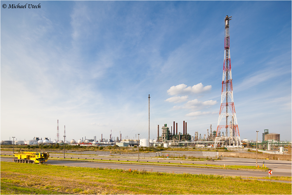 Überblick vom Scheldedeich mit einer der riesigen Fackeln.