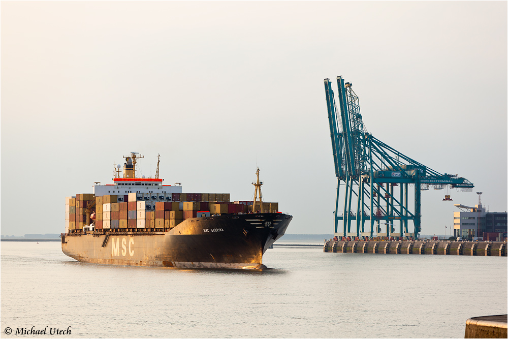 Ein Containerschiff läuft ein (in den Hafen, nicht beim Waschen...).