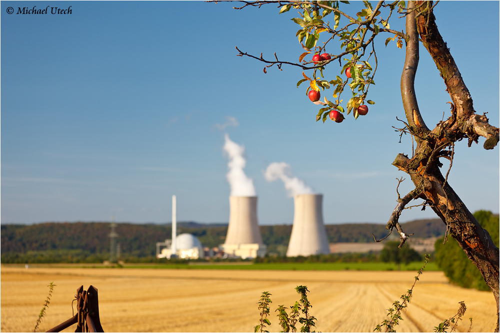 Ein trauriger Apfelbaum als Vordergrund zum Atomkraftwerk.