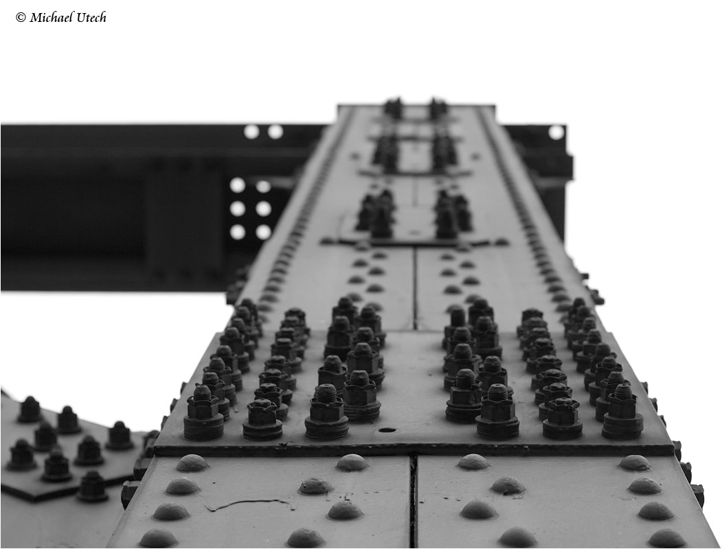 Eine alte Eisenbahnbrücke über den Kanal mit hunderten Nieten, Schrauben und Muttern.