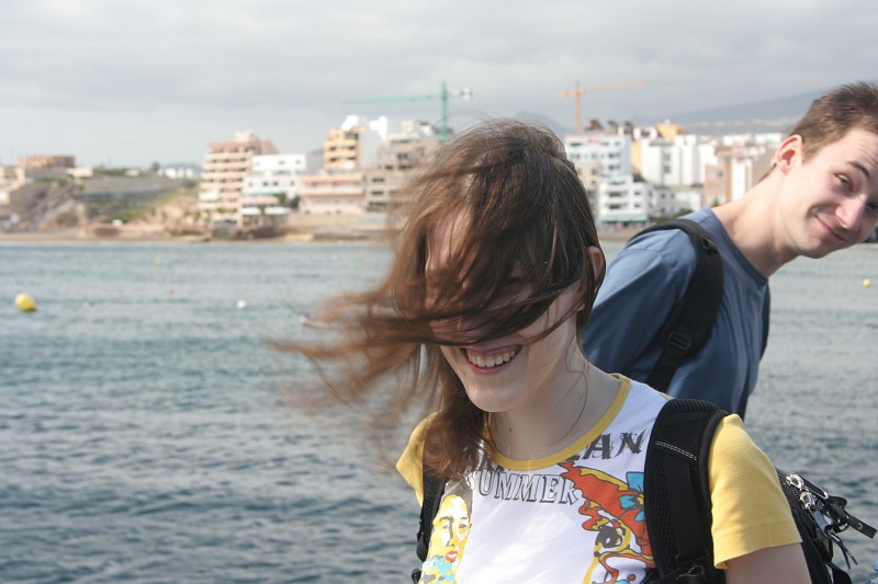 Reichlich zugig geht es im Surferparadies El Medano zu, wie man an Swantjes Haaren sieht.