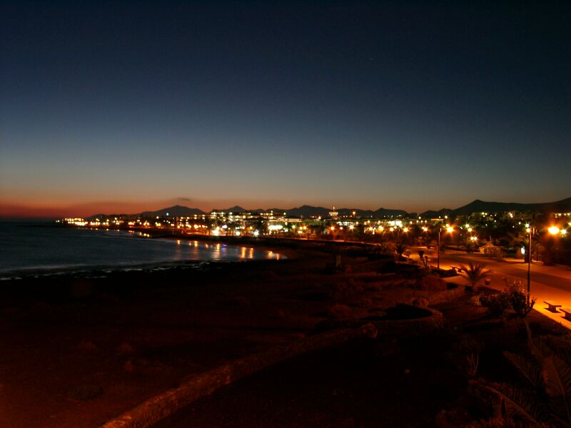Die hellerleuchtete Küste kurz nach Sonnenuntergang.