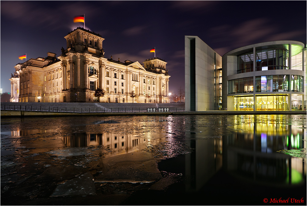 Der Reichstag hinter der mit Eisschollen übersäten Spree.