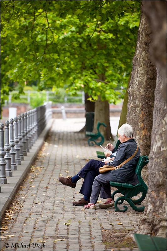 Touristen auf den typischen Bänken an den Brügger Kanälen.