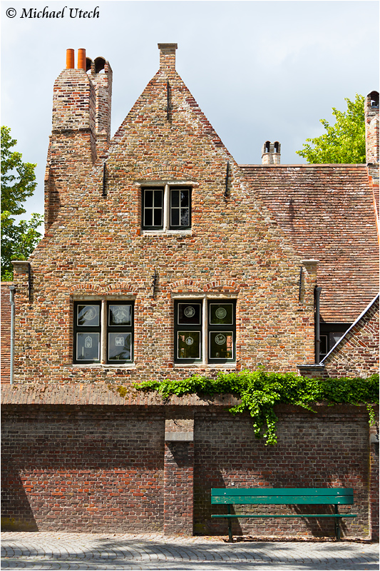 Eine Bank vor den alten Gebäuden des Beginenhof.