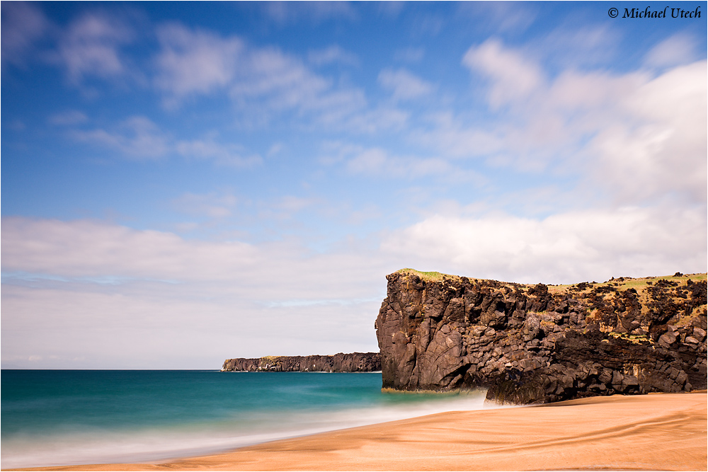 Langzeitbelichtung des goldenen Strandes in Skarðsvìk.