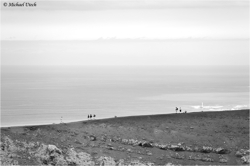 Touristen auf dem Kraterrand mit Blick Richtung Westküste.