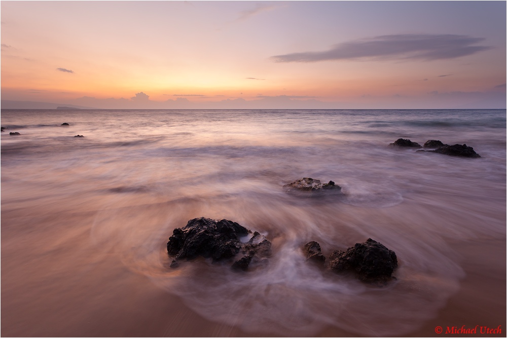 Ein schöner Sonnenuntergang passt zu den verwischten Wellen im Vordergrund.