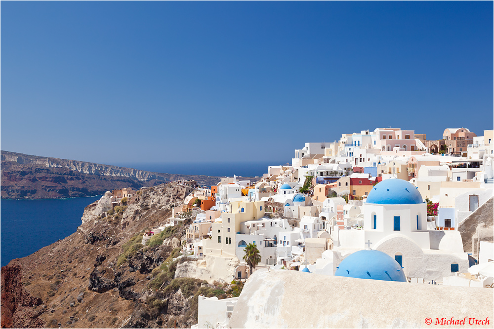 Blick über die blauen Kuppeln von Oía.
