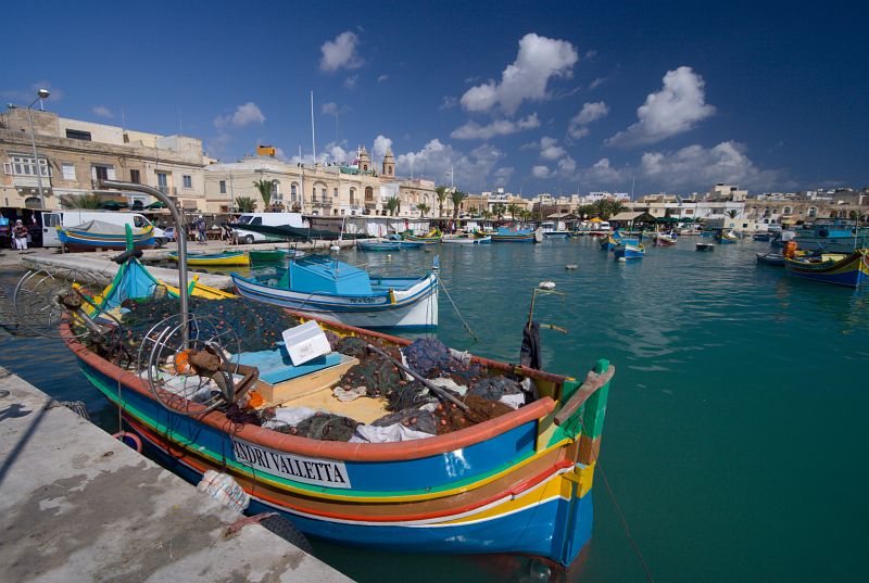 Der Hafen in Marsaxlokk. Zur Ankunftszeit mussten wir uns erstmal durch den Markt kämpfen, wobei dieser ausschließlich touristische Waren zu bieten hatte.