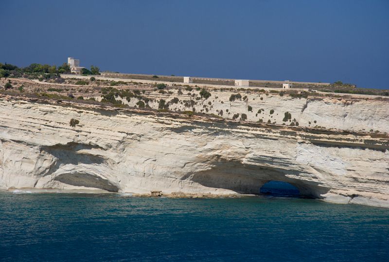 Sicht auf mächtige, weiße Klippen einer unterhöhlten Landzunge.