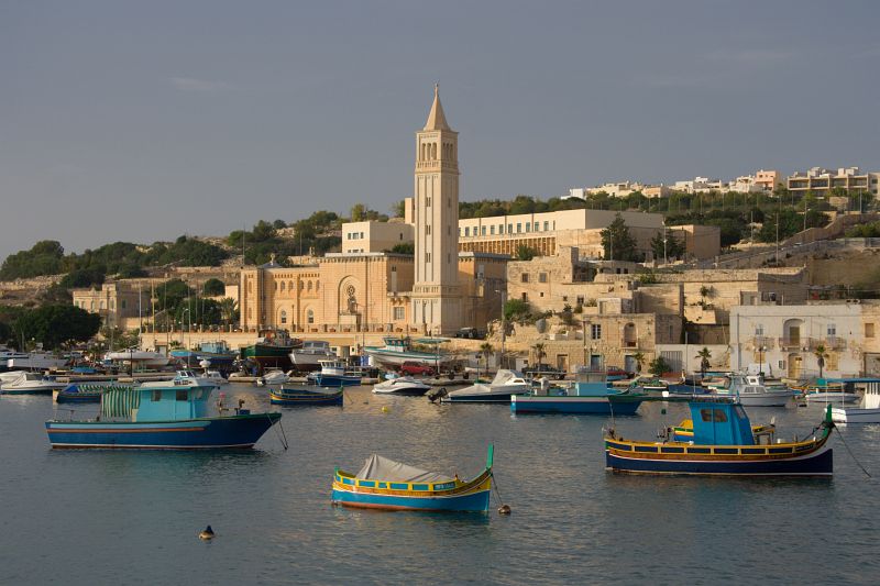 Hafen und moderens Kirchengebäude von Marsaskala.