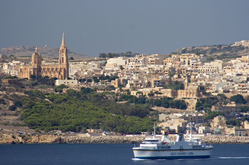 M'Garr auf Gozo, davor eine der Fähren, die durchgehend in kurzen Abständen verkehren.