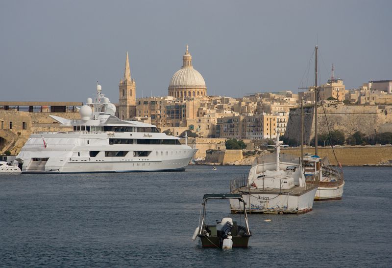 Der erste Teil der Fahrt führt durch den Marsamxett Harbor. Wer mit so einer kleinen Yacht vor Anker liegt nimmt für Ausflüge wohl gleich einen Hubschrauber...