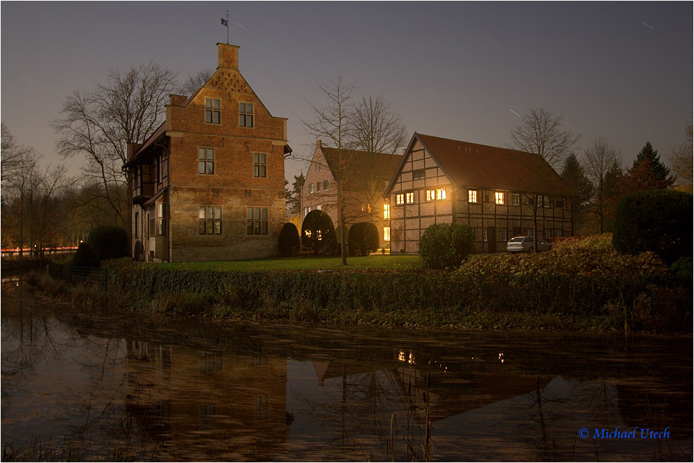 Haus Bisping, das alte Torhaus und die neueren Wohngebäude auf der Insel.
